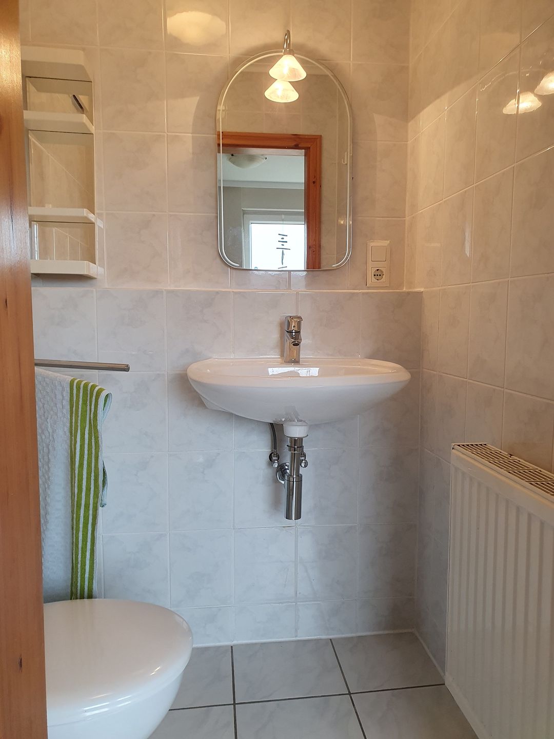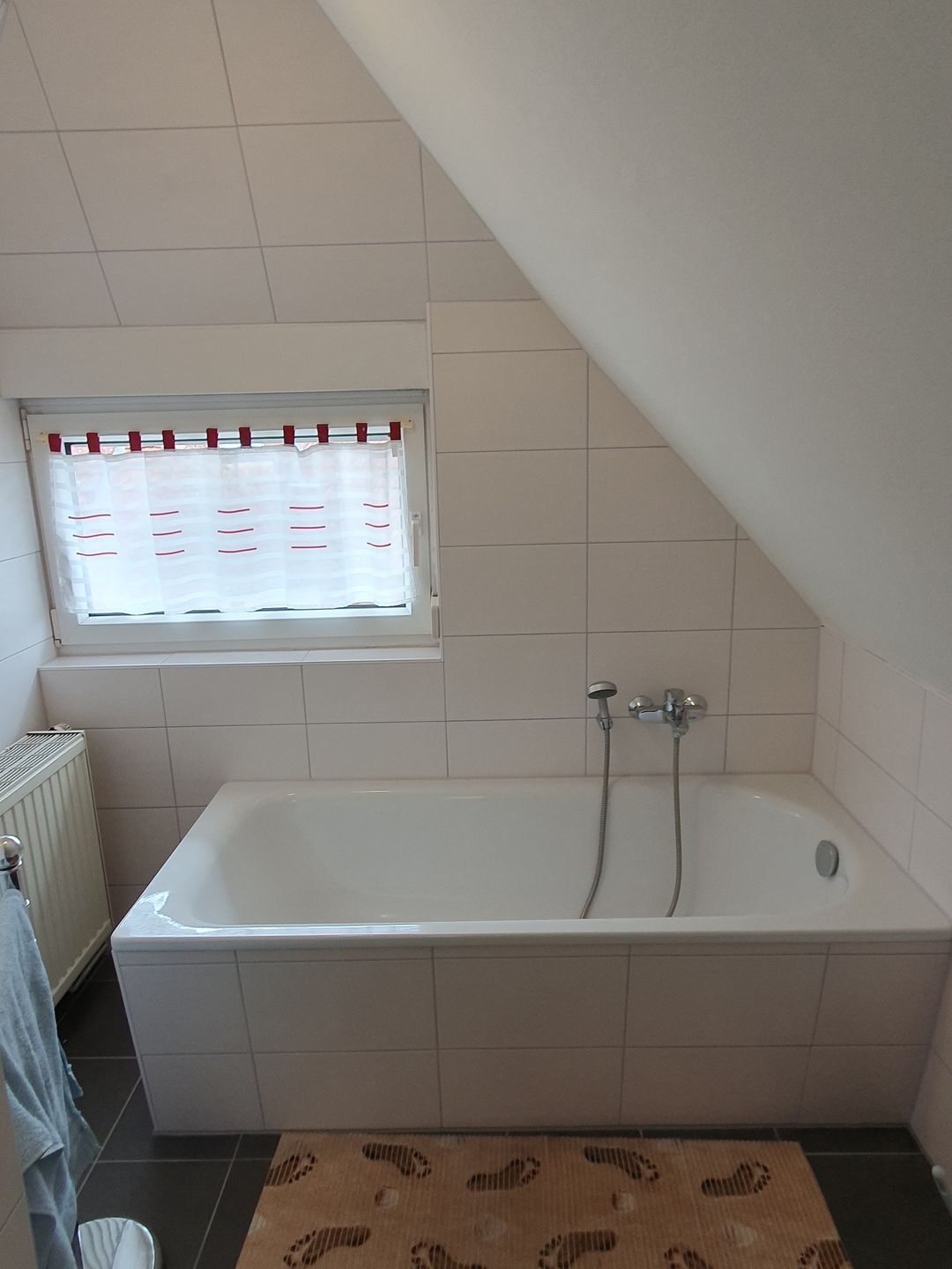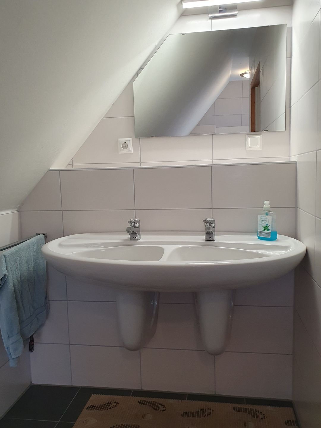 Die 75 m² große Ferienwohnung wird für maximal 4 Erwachsene und 1 Kind vermietet und liegt im 1. Obergeschoß. Über einen Flur gelangt man in das Wohnzimmer mit Schlafcouch für eine Person, integrierter Küche und Essecke, sowie Zugang zum Südbalkon. Auf dieser Etage sind auch eines der Schlafzimmer mit Doppelbett und das Gäste-WC zu finden. Eine Treppe im Wohnbereich führt in das Dachgeschoss, hier sind das zweite Schlafzimmer mit Doppelbett und das Badezimmer mit Badewanne untergebracht.