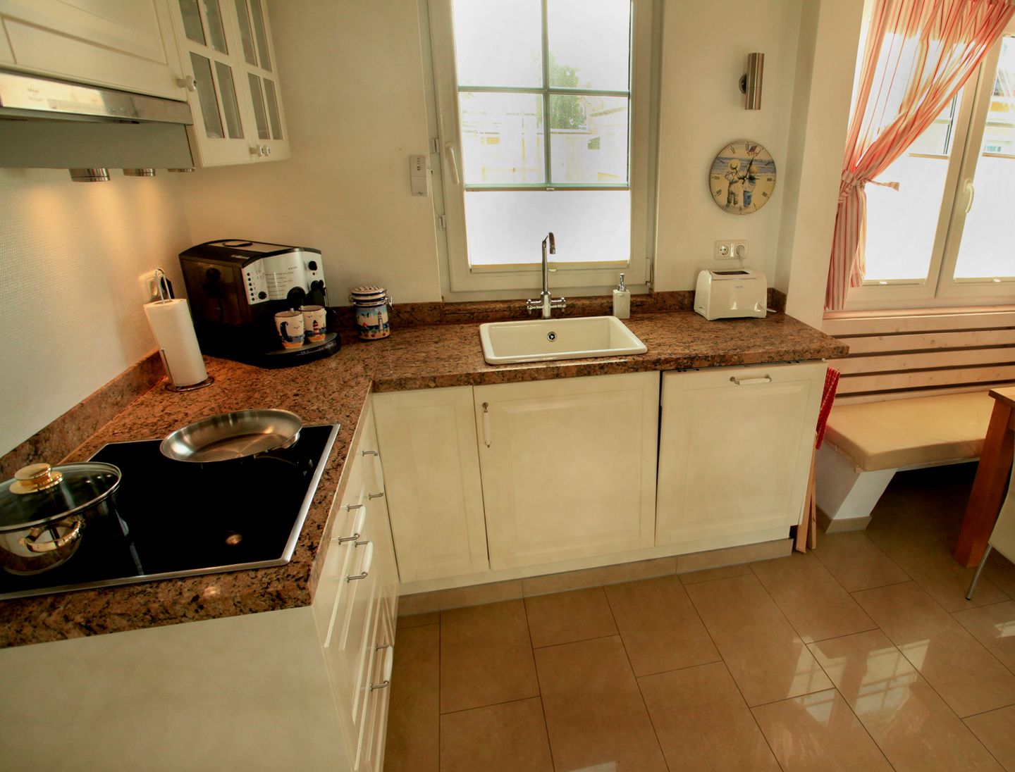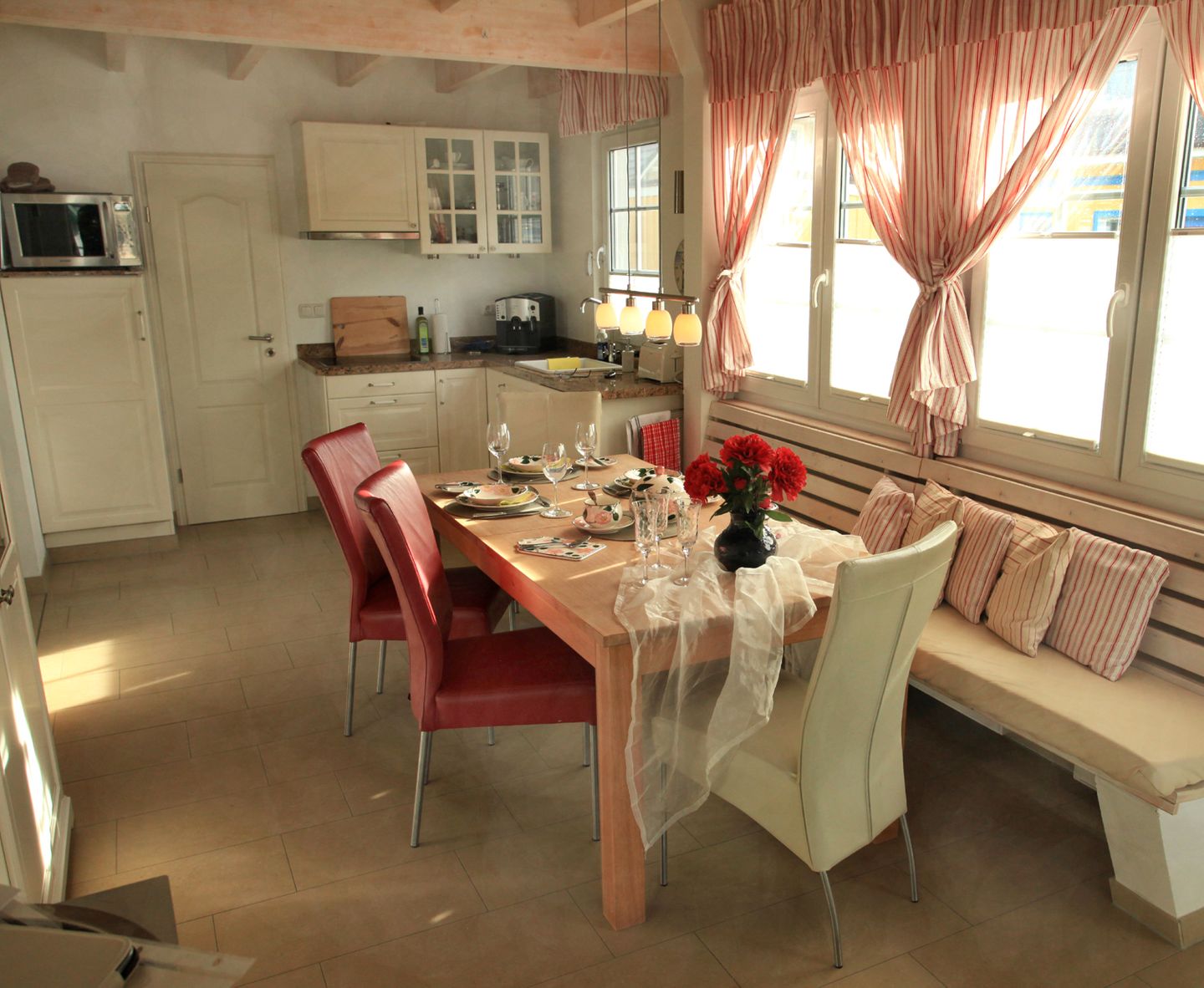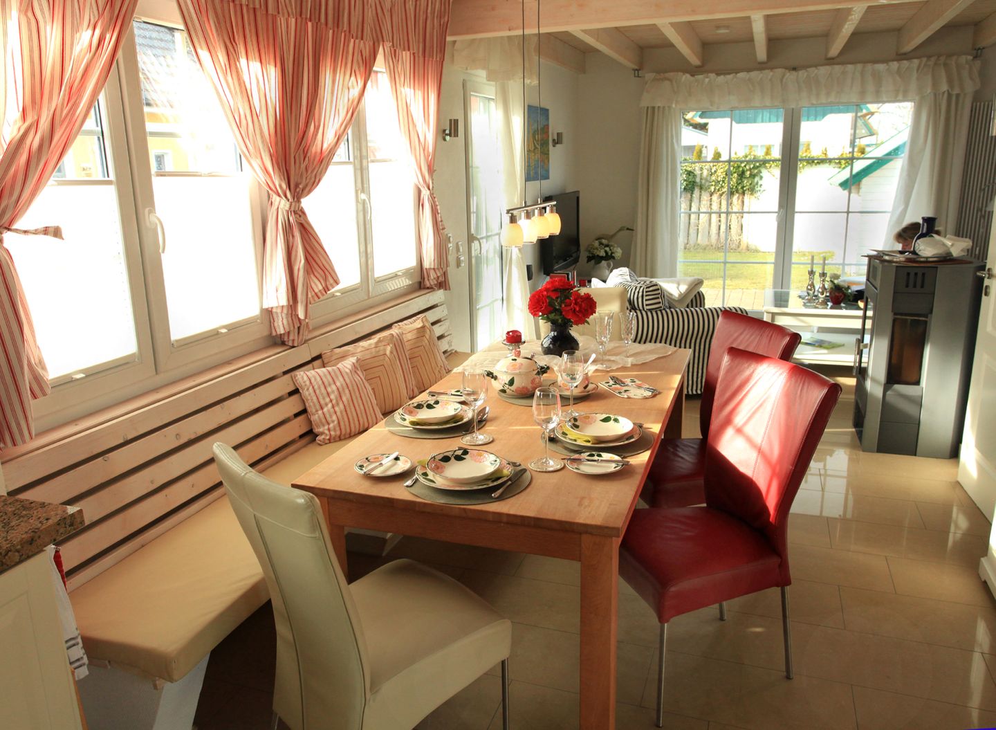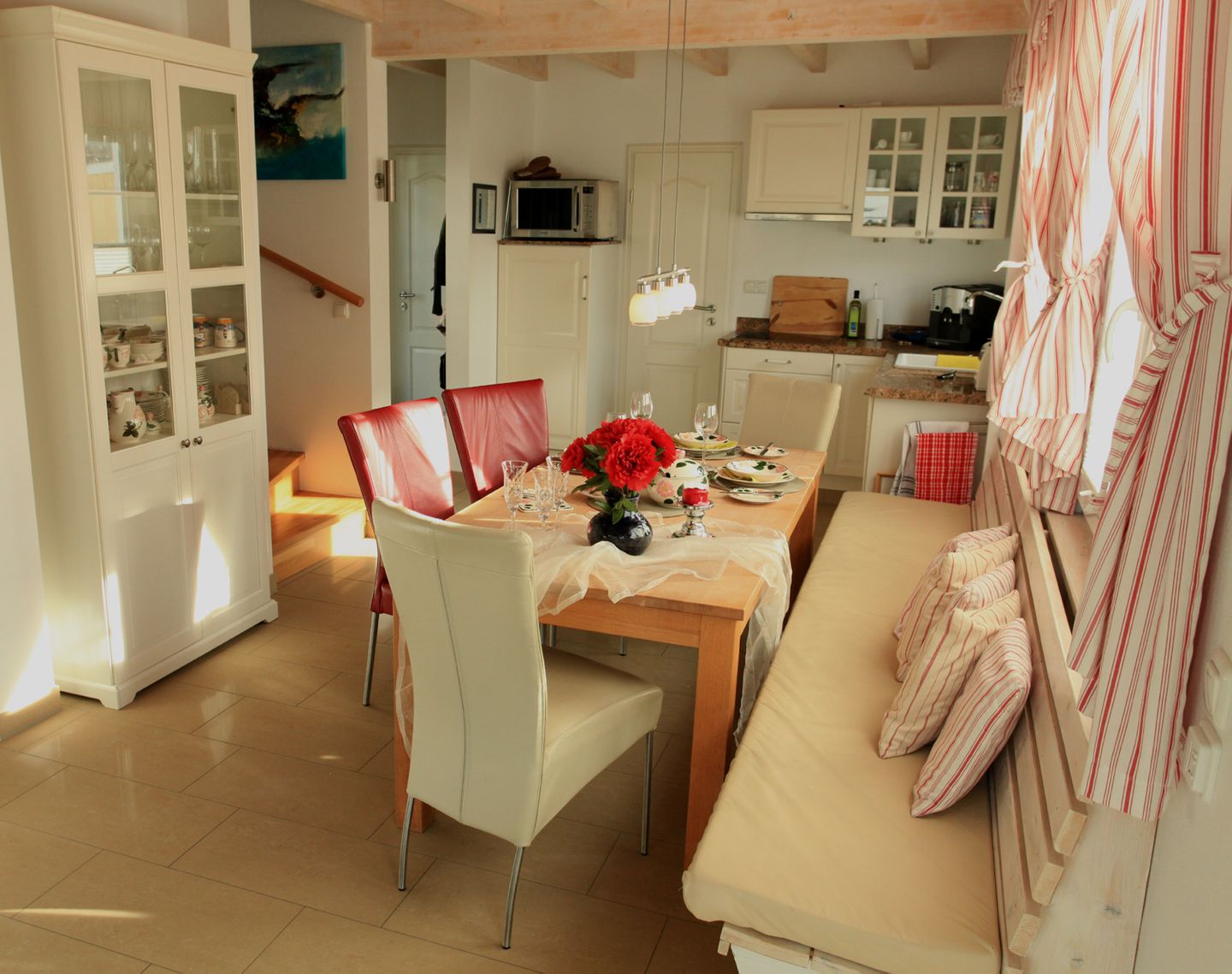 Im Erdgeschoss haben Sie ein Gäste-WC, die Hobbyköche-Küche mit Spülmaschine, Kaffee/Espresso-Vollautomat von Krups, dahinter die Essgruppe mit Eichentisch und langer Sitzbank und weiter zum Garten hin den Wohnbereich mit Kuschelcouch, Sessel und Hocker.