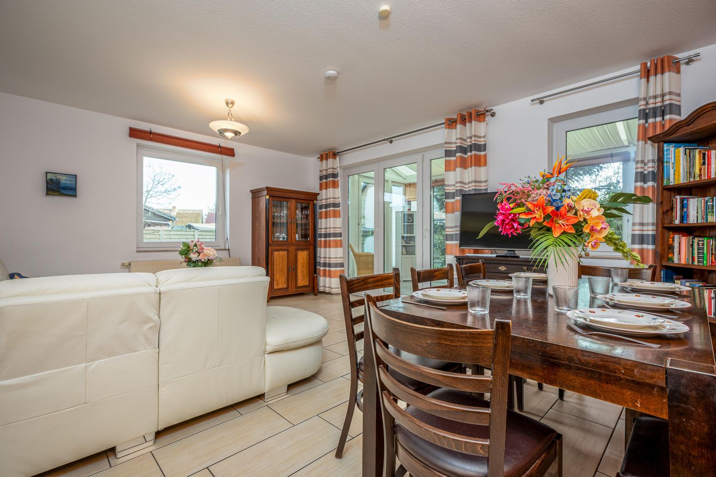 Das Feriendomizil Wiesenhaus lädt zum Urlaub in Zingst ein. Die Unterkunft bietet Platz für 8 Personen. In der unteren Etage befindet sich das gemütliche Wohnzimmer mit großem Esstisch und Blick in den Gartenbereich. Zwei Schlafzimmer sind mit Doppelbetten ausgestattet und zwei Zimmer mit jeweils 2 Einzelbetten. Die große Terrasse und der schöne Gartenbereich lädt zum Entspannen ein. Den wunderschönen Strand von Zingst ist nur 1300 Meter entfernt und bequem per Fuß zu erreichen.